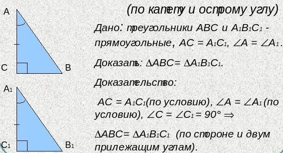 Признак равенства прямоугольных треугольников по катету и прилежащему острому углу