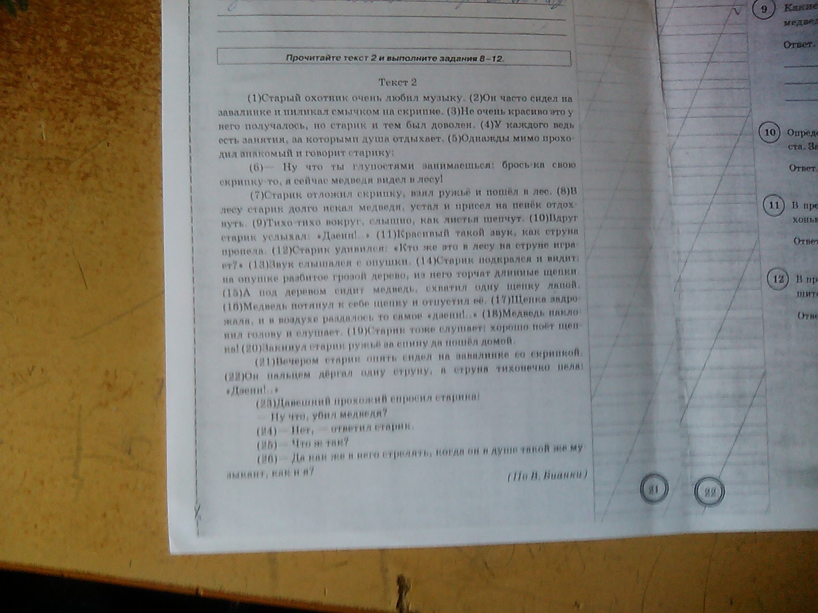 Старик любил музыку, это радовало его сердце и приносило удовольствие. Будучи охотником, он пошел в лес,чтобы убить медведя,но когда увидел его,играющего на разбитом дереве, музыку, то не смог его убить. А почему?Да потому, что медведь в душе тоже оказался музыкантом. Они были родственные души и не мог один музыкант убить другого. Основная мысль текста - любовь к музыке и у человека, и у животного.