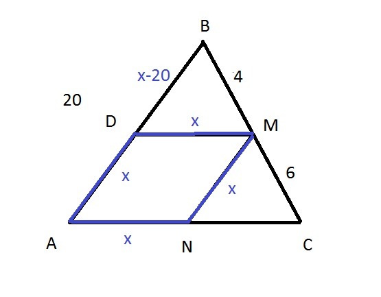 В треугольник ABC вписан ромб ADMN так что угол A у них общий, а вершина M принадлежит стороне BC. Найдите сторону ромба если CM=6 см BM=4 см AB=20 см