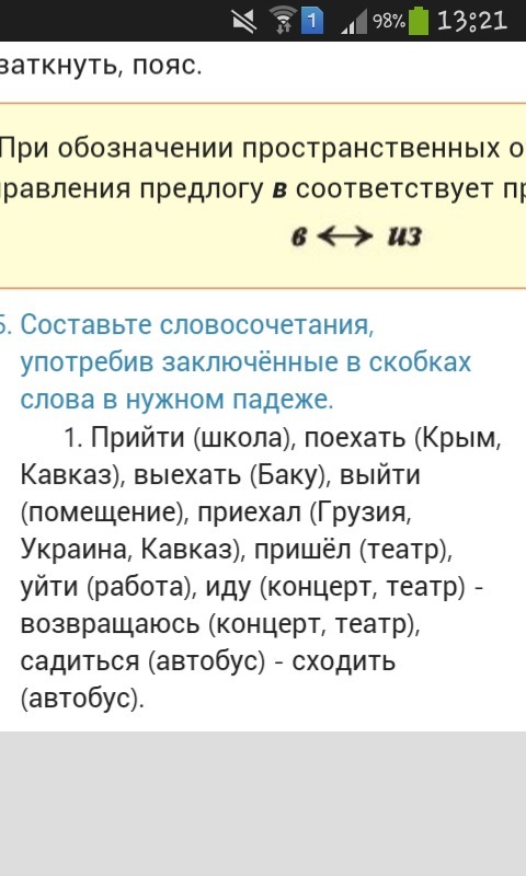 прийти в школу, поехать в крым, выехать в баку, выйти из помещения, приехал из грузии, пришёл в театр, иду в театр, возвращаюсь из театра, сел в автобус, вышел из автобуса.