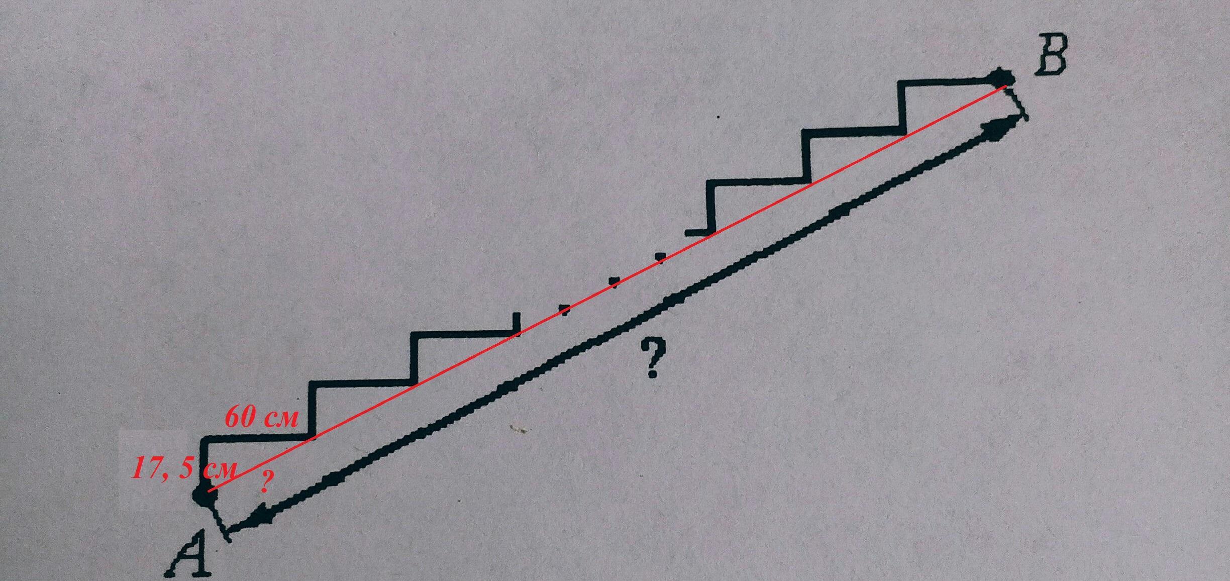 Каждая ступенька это прямоугольный треугольник с катетами 17,5 см и 60 см . Расстояние между точками А и В будет равно сумме гипотенуз этих ступенек.