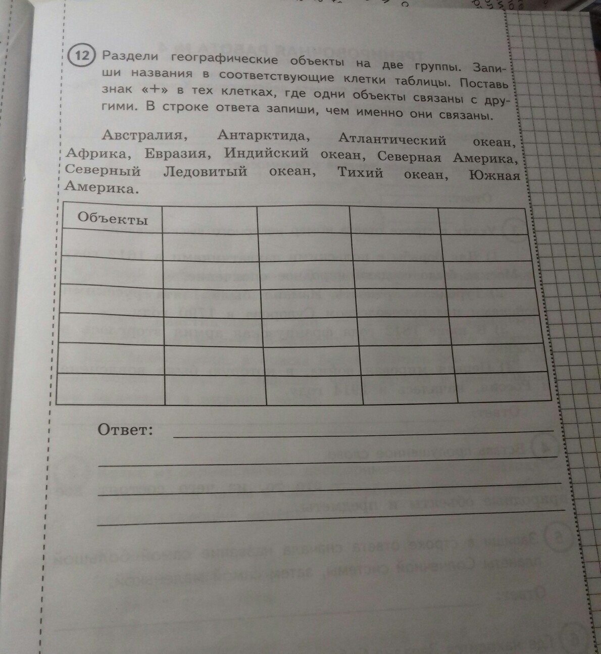 Раздели географические объекты на две группы.Запиши названия в соответствующие клетки таблицы.Поставь знак "+" в тех клетках,где одни объекты связаны с другими.В строке ответа запиши,чем именно они связаны.