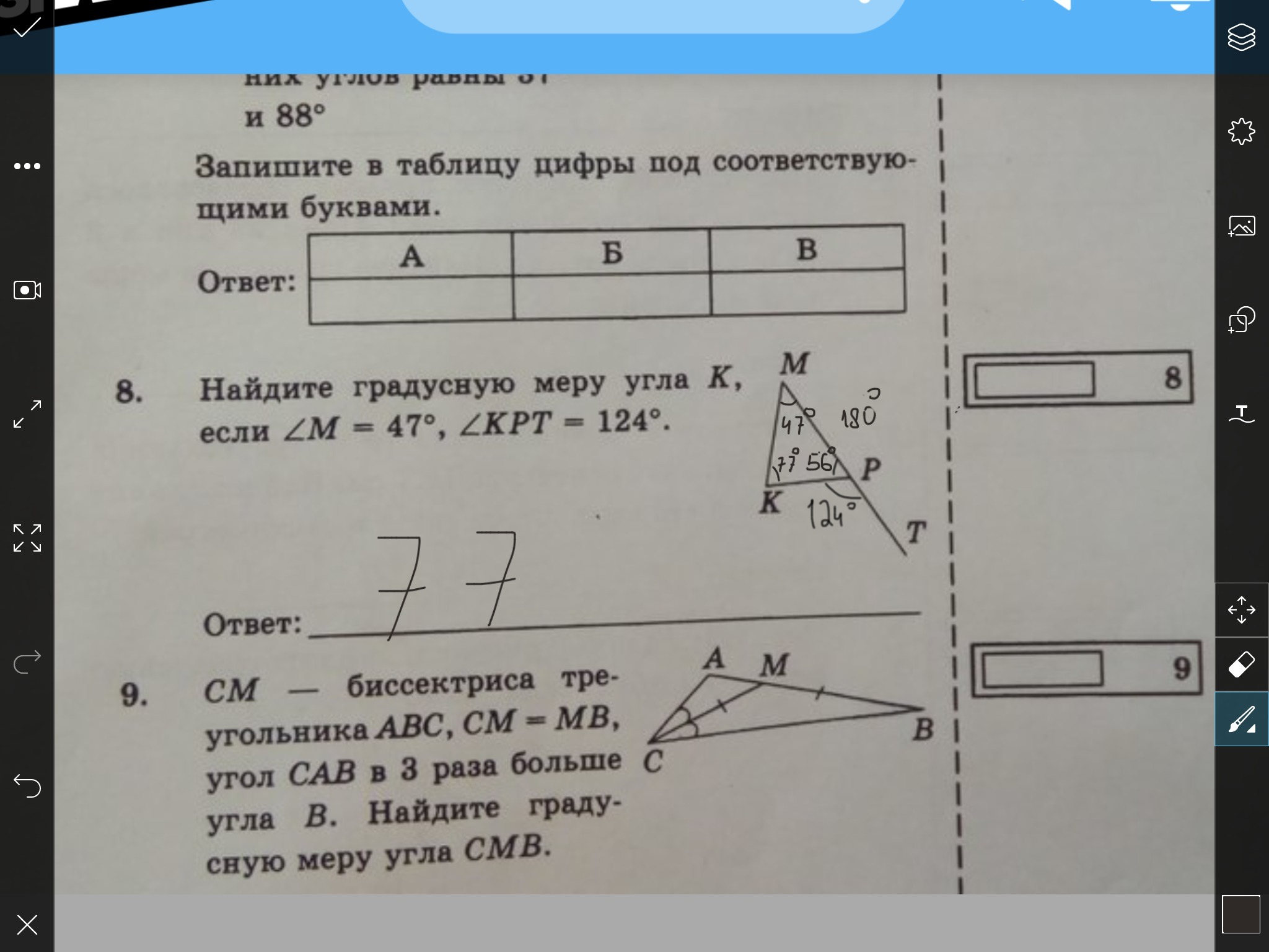 Найдите градусную меру угла K, если угол M=47 градусов, Угол KPT=124 градусам.