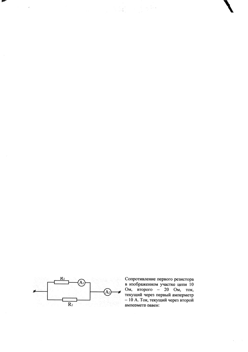 Сопротивление первого резистора в изображенном участке цепи 10 Ом , второго – 20 Ом, ток, текущий через первый амперметр -10 А. Ток, текущий через второй амперметр равен?