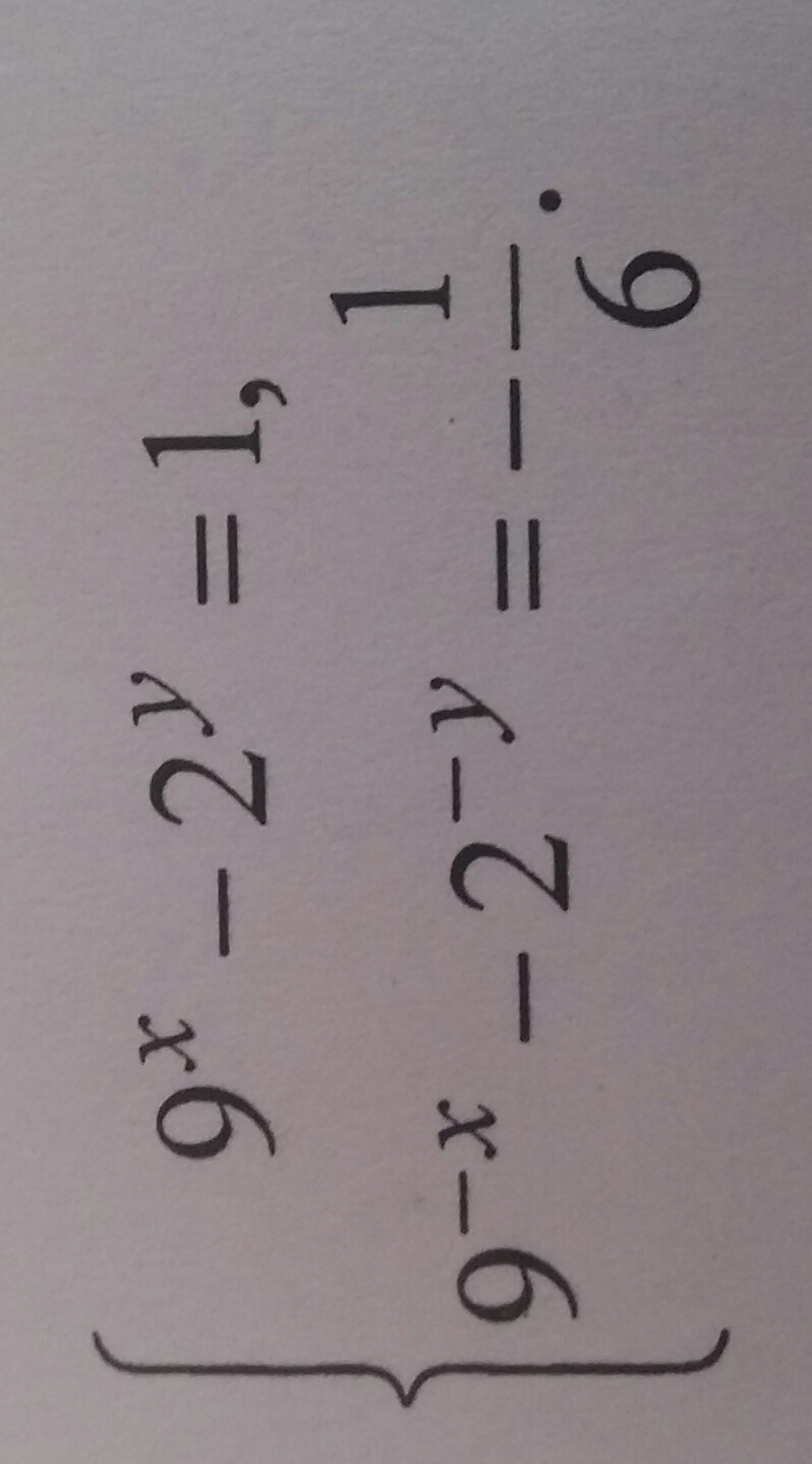 left { {{9^{x}-2^y}=1} atop {9^{-x}-2^{-y}=-frac{1}{6}}} right. ; ;  left { {{9^{x}-2^{y}=1} atop {frac{1}{9^{x}}-frac{1}{2^{y}}=- frac{1}{6} }} right. ; ;  left { {{9^{x}-2^{y}=1} atop { frac{2^{y}-9^{x}}{9^{x}cdot 2^{y}}=-frac{1}{6} }} right. ;  left { {{9^{x}-2^{y}=1} atop {frac{-1}{9^{x}cdot 2^{y}}=-frac{1}{6}}} right. \\ left { {{9^{x}-2^{y}=1} atop {9^{x}cdot 2^{y}=6}} right. ; ;  left { {{frac{6}{2^{y}}-2^{y}=1} atop {9^{x}=frac{6}{2^{y}}} right.