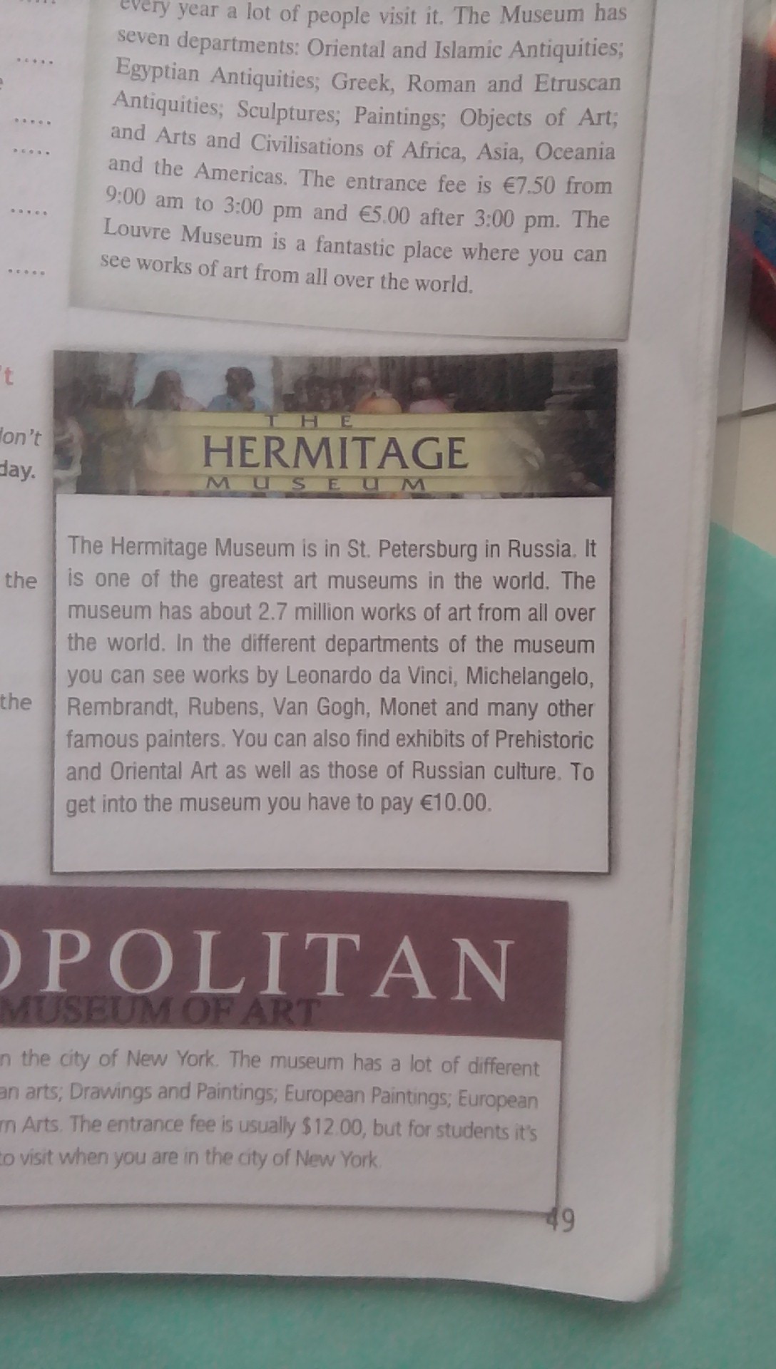 Музей Эрмитаж находится в Санкт-Петербурге в России. Он является одним из величайших музеев мира. В музеее находятся более чем 2.7 млн работ со всего света(мира). В разных частях (или отделах, не знаю, что у них там) музея вы можете увидеть работы Леонардо да Винчи и других знаменитых художников. Также вы можете найти экспонаты доисторического и восточного искусства также и русской культуры. Чтобы посетить музей, вы должны заплатить 10 евро.