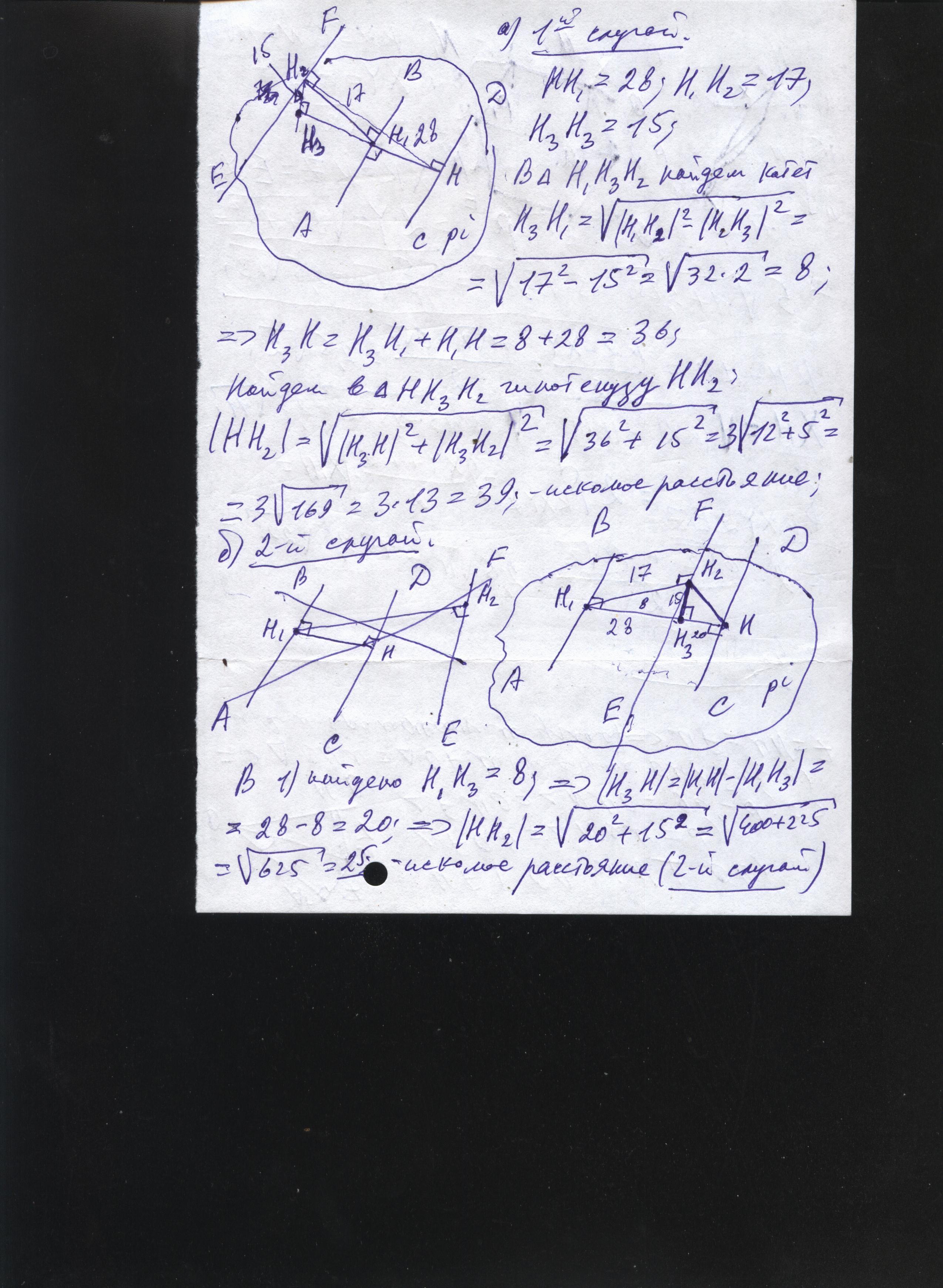 Пусть AB и CD две параллельные прямые, лежащие в плоскости pi, на расстоянии 28 см одна от другой, EF - прямая, параллельная AB и удаленная от AB на 17см, а от плоскости pi - на 15см. Найдите расстояние между EF и CD. (рассмотреть 2 случая)