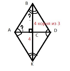 Гипотенуза равна 4, катет 2, поэтому угол, лежащий напротив катета, равен 30 °. Так как диагонали делятся под прямым углом, то угол ACB = 90°. Найдем угол ВАС, угол ВАС = 90° - 30° = 60°