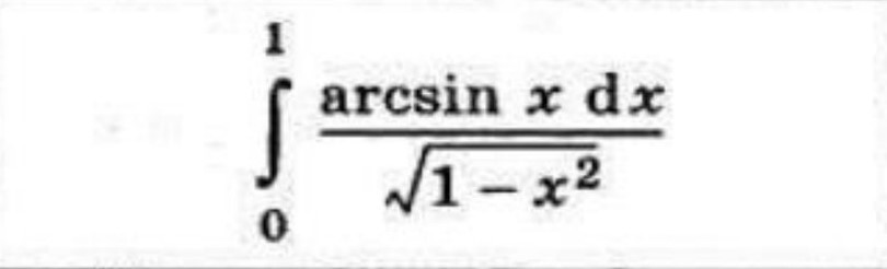 \ int_{0}^{1}{arcsin{x}oversqrt{1-x^2}}mathrm dx=|u=arcsin{x},sqrt{1-x^2}du=dx|=int_{0}^{1}umathrm du={1over2}u^2|_{0}^{1}={arcsin^2{x}over2}|_{0}^{1}={1over2}(arcsin^2{1}-arcsin^2{0})={1over2}cdot{pi^2over4}={pi^2over8}