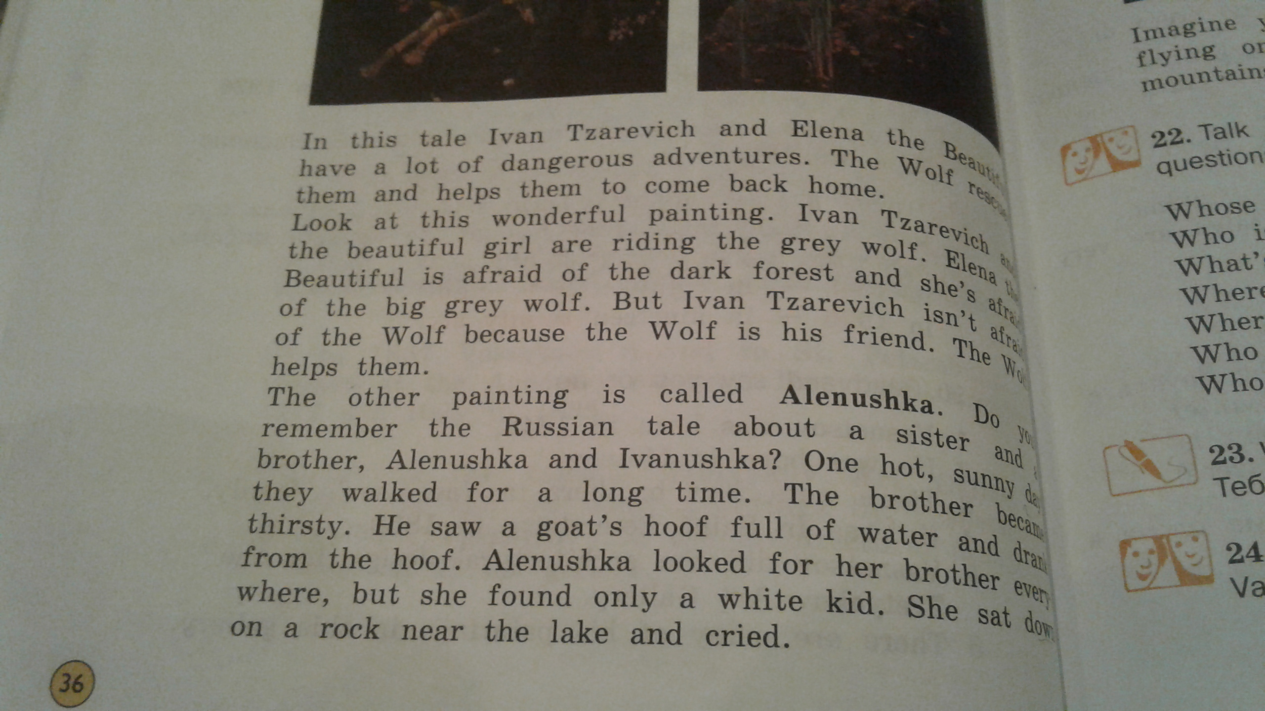 Посмотрите на эту прекрасную картину. Иван Царевич и красивая женщина едут на сером волке. Елена Прекрасная боится темного леса и она боится большого серого волка. Но Иван Царевич не боится волка, потому что она его друг. Волк помогает им.
