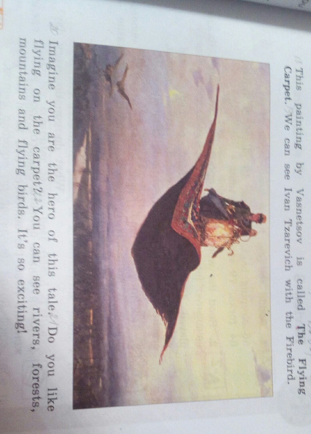 эта картина Васнецова называется ковёр-самолет. на ней Иван-царевич и Жап-птица.ваабрази, что ты герой этой сказки. тебе нравиться летать на ковре? ты можешь видеть реки, леса, горы и птиц. это восхитительно!