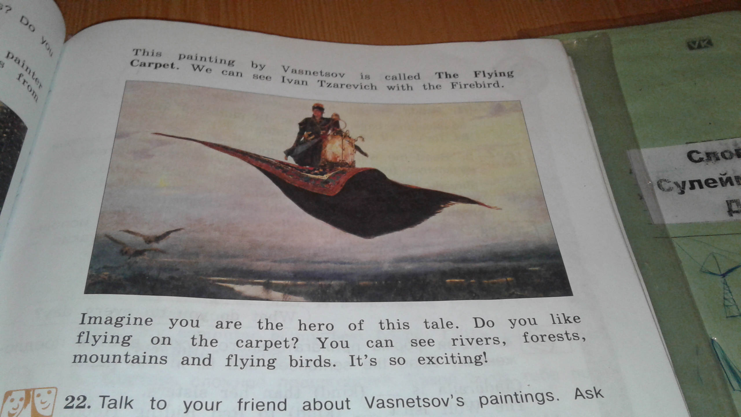 Эта картина Васнецова называется «Летающий ковер». Мы можем увидеть Ивана Царевича с Жар-птицей. Представь, что ты герой этой сказки. Вам нравится летать на ковре? Вы можете увидеть реки, леса, горы и летающих птиц. Это так здорово!