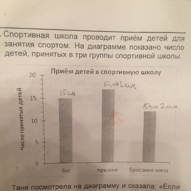 Таня посмотрела диаграмму сказала если из группы прыжкам 2 человека перейдут в группу бросания мяча то во всех трёх группах будет одинаковое число ребят. Права ли Таня?