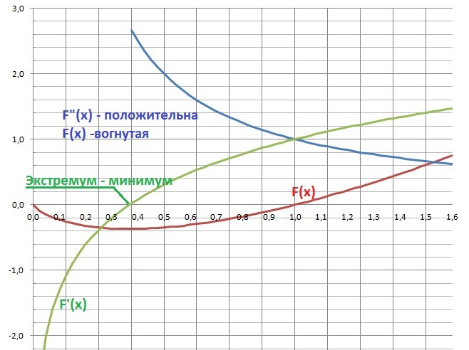 Критическая точка - минимум при Х = 1/е = 0,36787