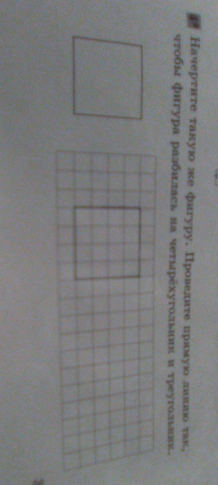 Начертите такую же фигуру. Проведите прямую линию так, чтобы фигура разбилась на четырёхугольник и треугольник.