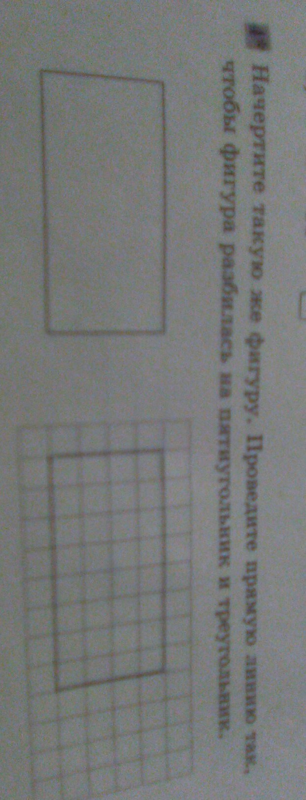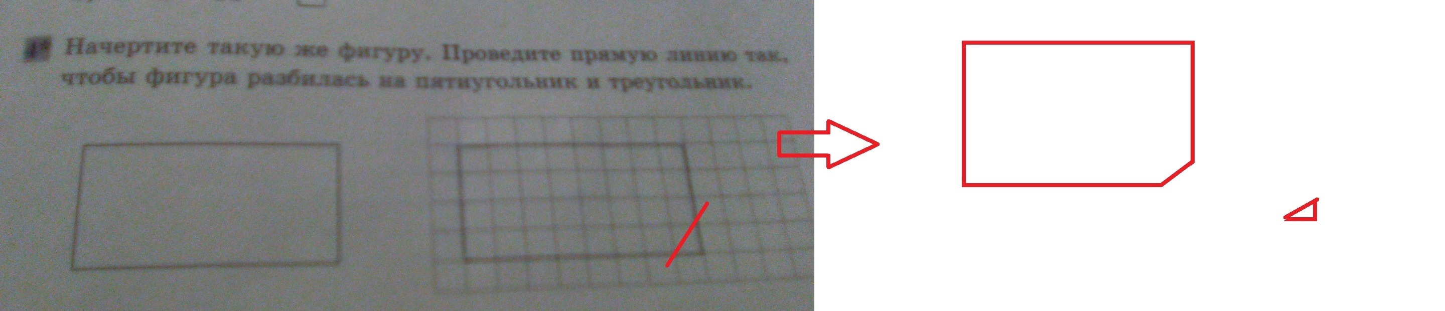 Начертите такую же фигуру. Проведите прямую линию так чтобы фигура разбилась на пятиугольник и треугольник.