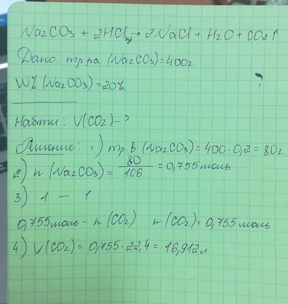 К раствору карбоната натрия массой 400г и массовой долей растворенного вещества 20% добавили избыток раствора соляной кислоты. Рассчитайте объём выделившегося оксида углерода (IV) (н.у.).