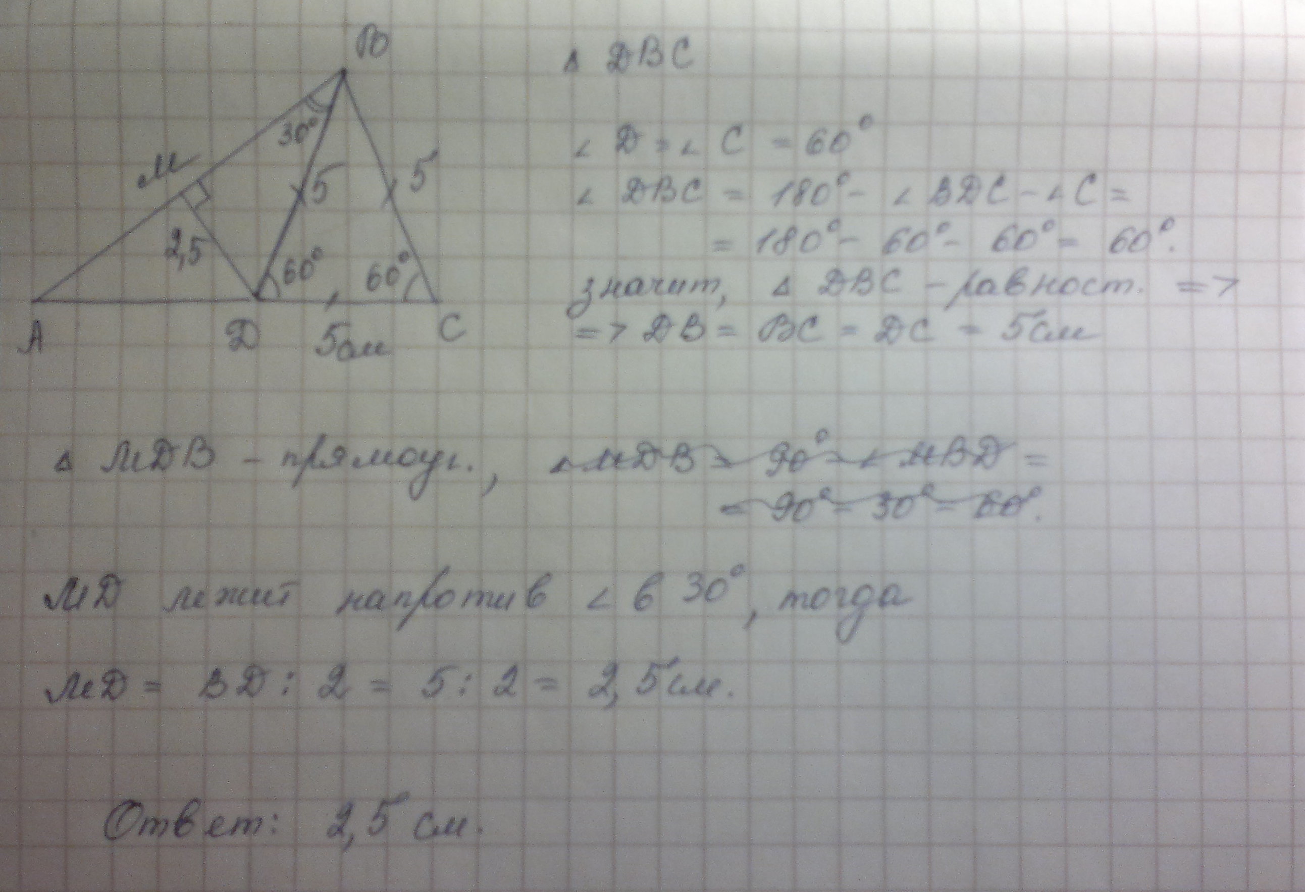 Решите,пожалуйста,задачу: В треугольнике ABC угол С равен 60 градусам. На стороне АС отмечена точка D так,что угол BDC равен 60 градусам,угол ABD равен 30 градусам,CD равна 5 см. Найдите расстояние от точки D до стороны АВ