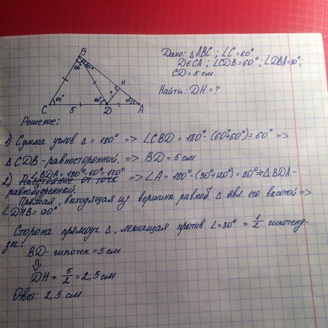 Решите,пожалуйста,задачу: В треугольнике ABC угол С равен 60 градусам. На стороне АС отмечена точка D так,что угол BDC равен 60 градусам,угол ABD равен 30 градусам,CD равна 5 см. Найдите расстояние от точки D до стороны АВ
