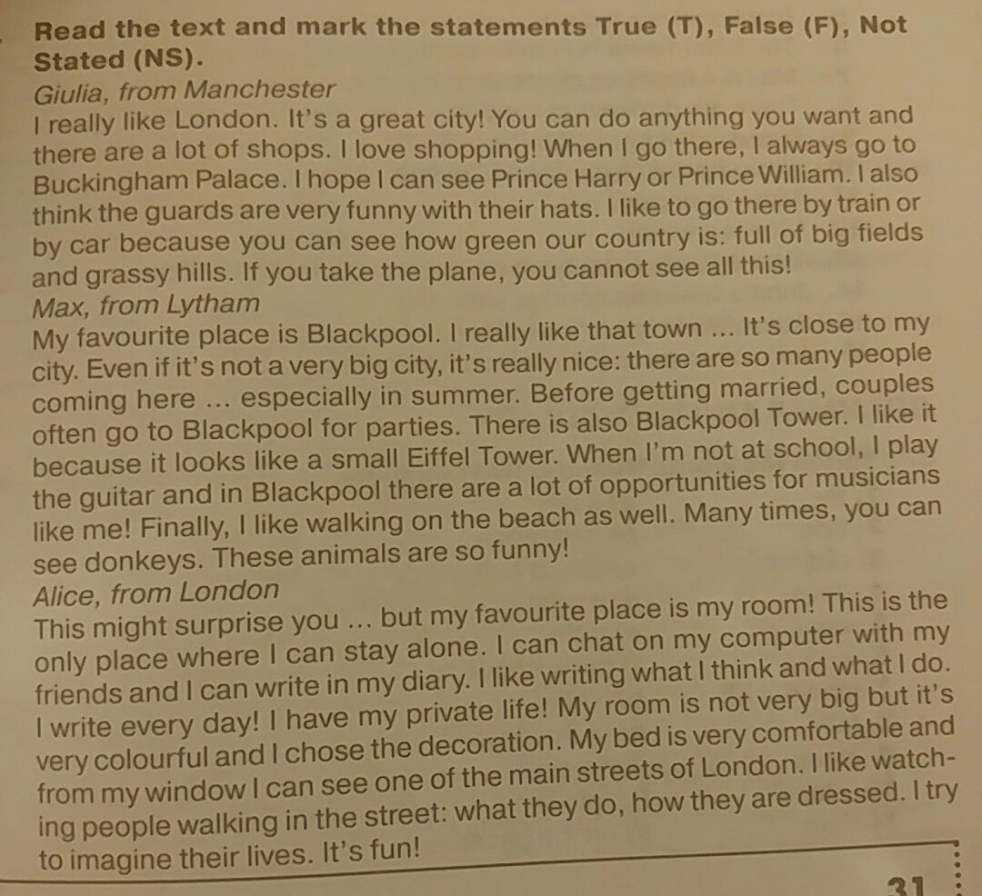 I like England but I prefer India! I go there every year with my family. We take the plane from London to Mumbai. Sometimes we stop in Delhi because it's very near to Taj Mahal, in Agra. I don't really enjoy taking the plane because I'm always scared it's going to crash. I know it happens very rarely, but I'm afraid of it anyway. So, my favourite place in India is Mumbai I like to watch cricket there! I also love Indian movies.