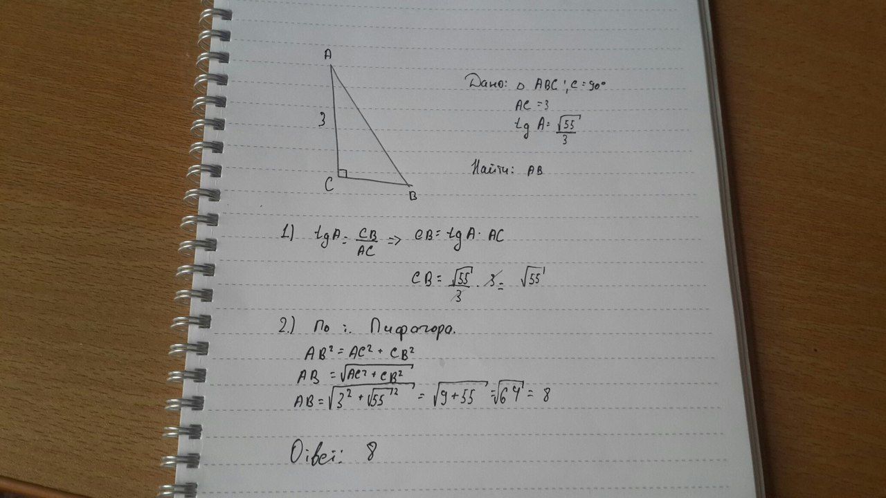 помогите)) в треугольнике ABC , угол C равен 90 градусов , AC равен 3, тангенс A равен корень из 55 деленный на 3. найдите AB