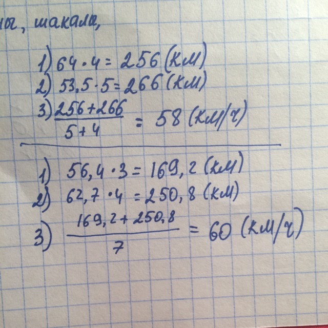 2)Автомобиль ехал 3 часа со скоростью 56,4 км/ ч и 4 часа со скоростью 62,7 км/ ч