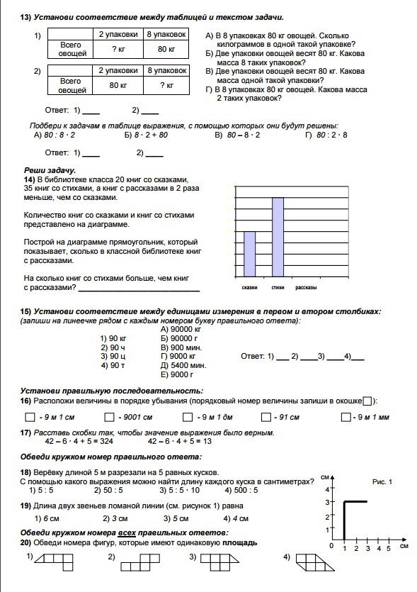 13) 1)Г 2)б к первой задаче выражение-А, ко второй- Г 14) 20:2=10 (прямоугольник будет до второй полоски) 35-10=25(кн) со стихами больше, чем с рассказами 15) 1-б. 2-д. 3-г. 4-а 16) 3,1,2,5,4. 17) (42-6)*(4+5)=324 42-(6*4+5)=13. 18)4. 19) 3- 5см 20) 1 и 4