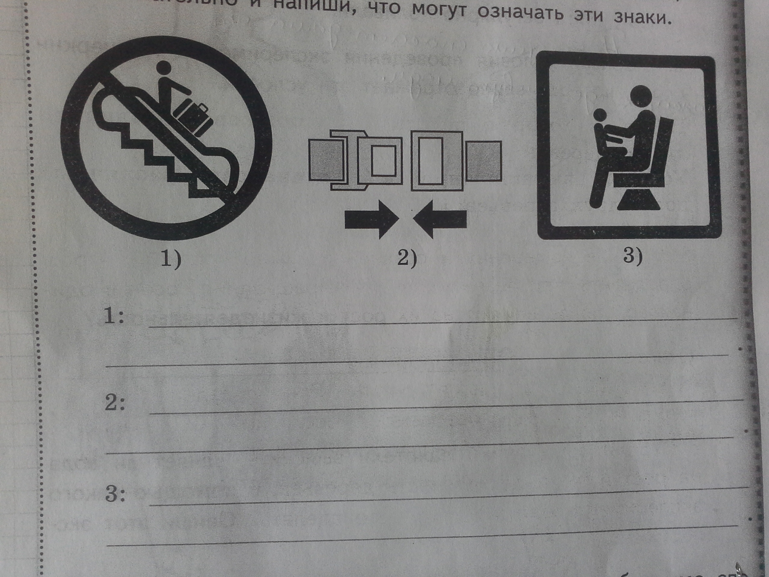 На рисунках изображены знаки которые можно встретить соответственно в метро, самолёте автобусе.Рассмотри их внимательно и напиши что могут означать эти знаки.