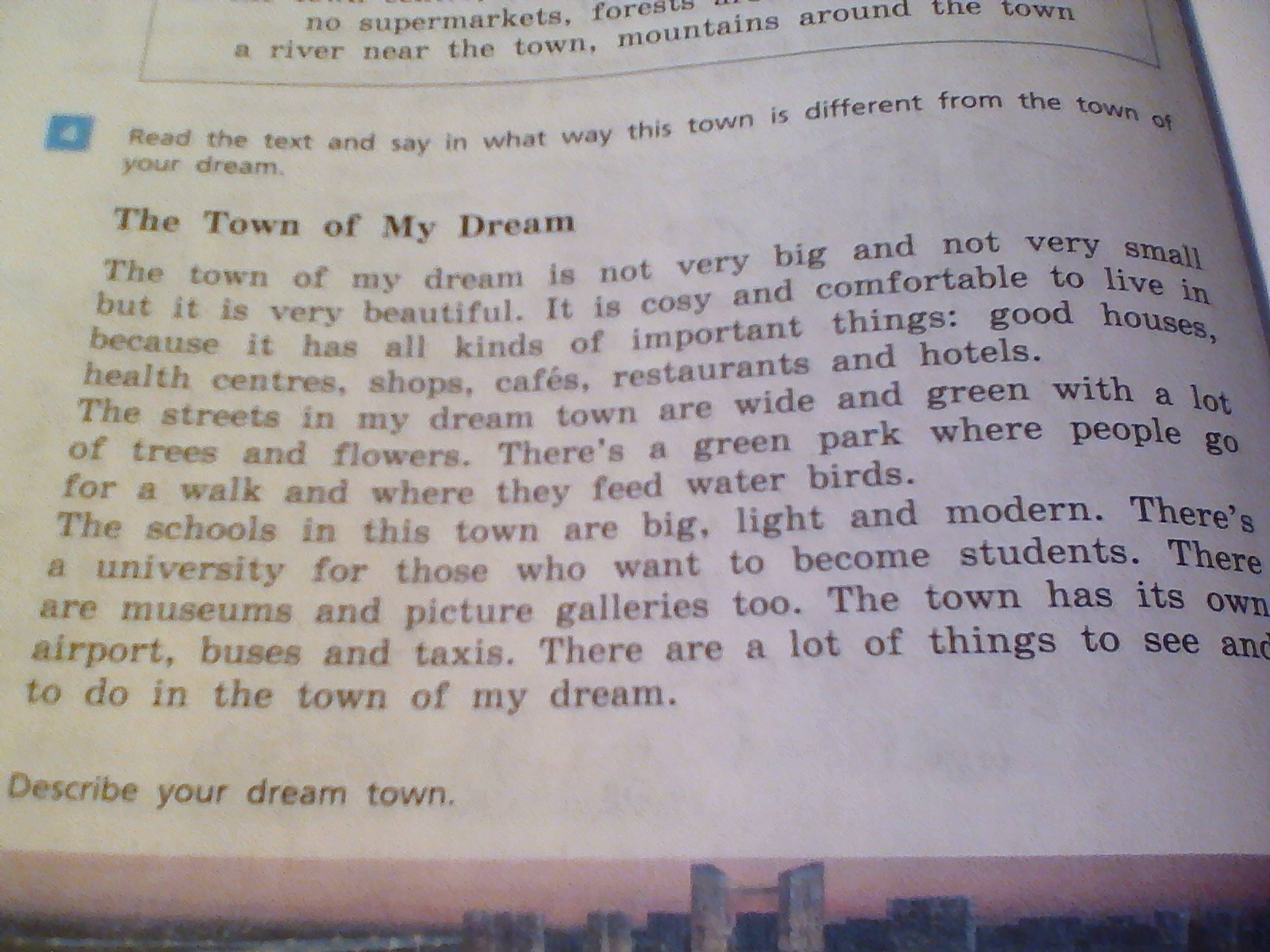 Школы в этом городе большие, светлые и современные. Здесь есть университет для тех, кто хочет стать студентом. Здесь есть музеи, а также картинные галереи. У города есть свой аэропорт, автобусы и такси. Здесь много вещей, которые можно увидеть и сделать, в городе моей мечты.
