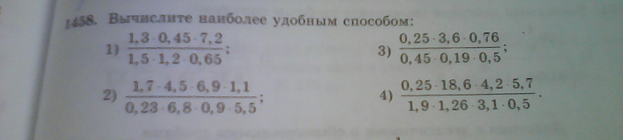 frac{1.3*0.45*7.2}{1.5*1.2*0.65}= frac{1.3*1.5*0.3*1.2*6}{1.5*1.2*1.3*5}= frac{0.3*6}{5}=0.36 \  \  frac{1.7*4.5*6.9*1.1}{0.23*6.8*0.9*5.5}= frac{1.7*0.9*5*0.23*3*1.1}{0.23*1.7*4*0.9*1.1*5}= frac{3}{4}=0.75 \  \  frac{0.25*3.6*0.76}{0.45*0.19*0.5}= frac{5*0.5*3*0.12*0.19*4}{3*5*0.03*0.19*0.5}=  frac{0.12*4}{0.3} = frac{0.03*4*4}{0.03}=4*4=16 \  \  frac{0.25*18.6*4.2*5.7}{1.9*1.26*3.1*0.5}= frac{5*0.5*3.1*6*2*2.1*1.9*3}{1.9*2*2.1*0.3*3.1*0.5}= frac{5*6*3}{0.3}=frac{5*6*0.3*10}{0.3}=300