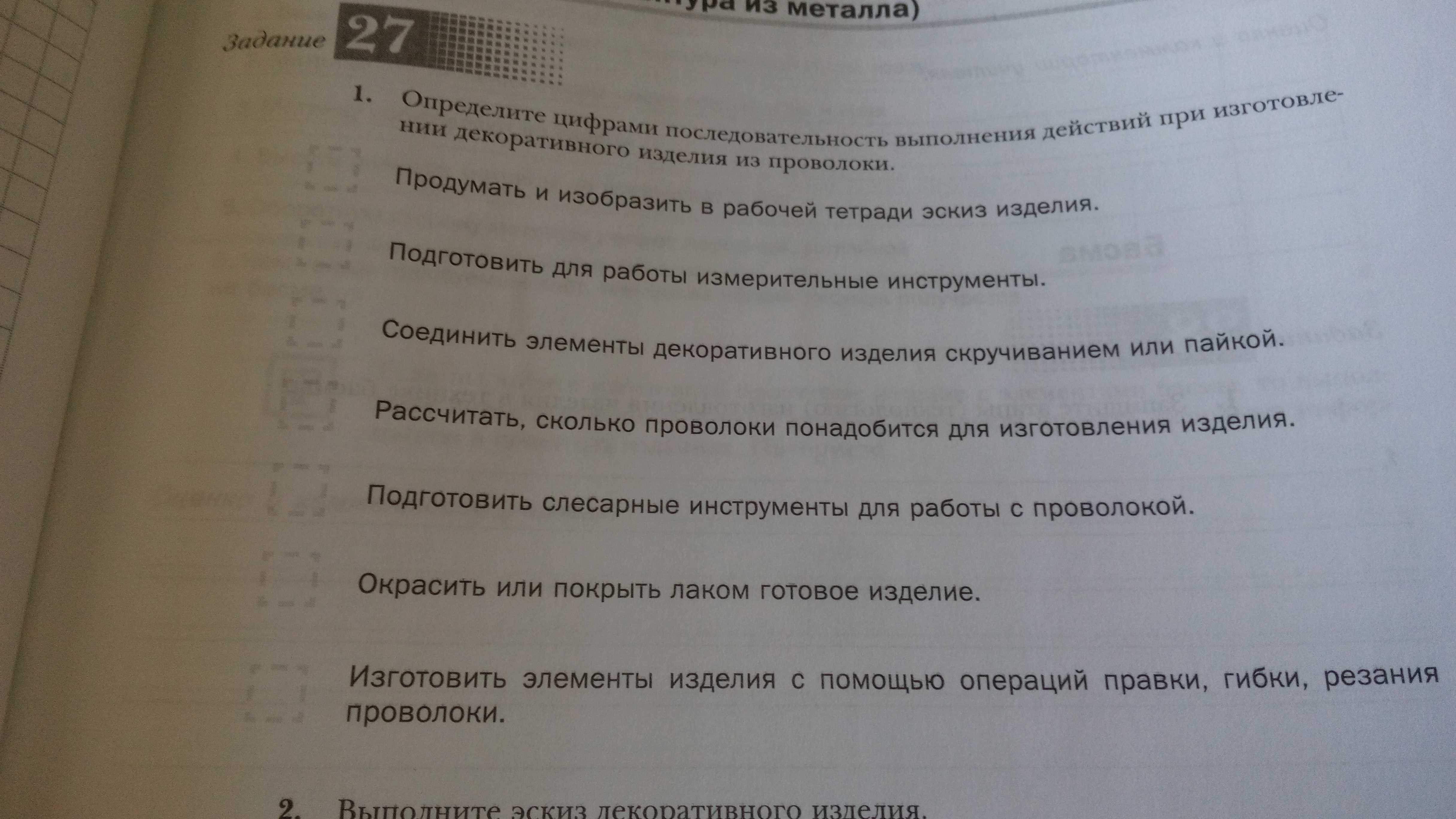 Определите цифрами последовательность выполнения действий при изготовлении декоративного изделия из проволоки