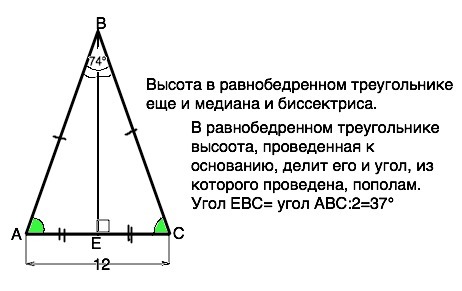 В равнобедренном треугольнике ABC с основанием AC отрезок BE - высота. Найдите угол EBC, если AC =12 см и угол ABC =74°