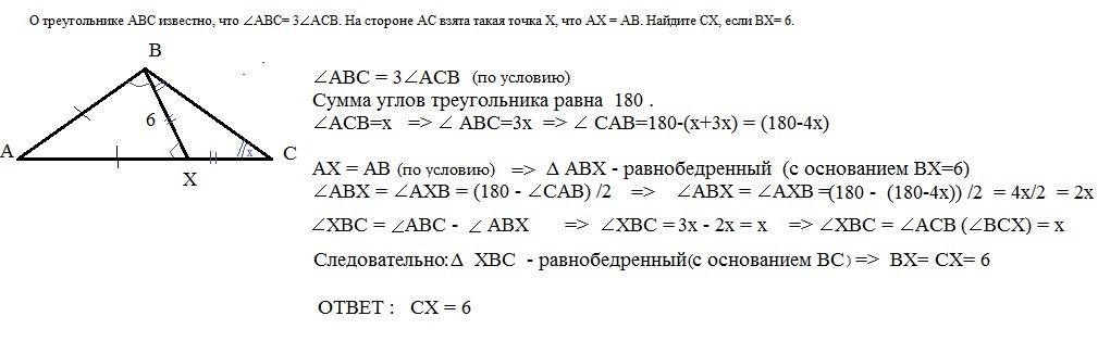 О треугольнике ABC известно, что ∠ABC= 3∠ACB. На стороне AC взята такая точка X, что AX = AB. Найдите CX, если BX= 6.