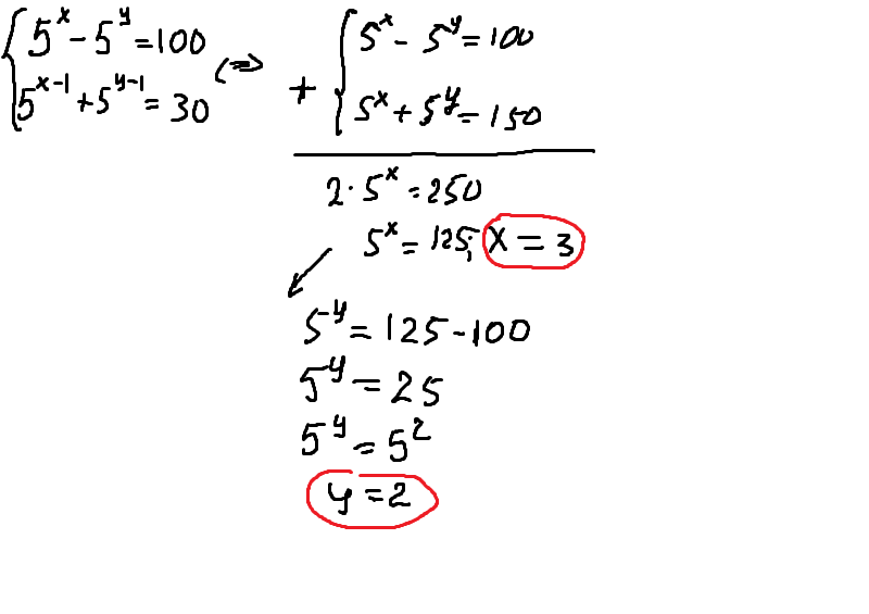 5(в степени х)-5(в степени у)=100 и 5(в степени х-1)+5(в степени у-1)=30