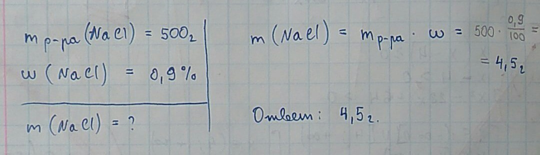 Физиологическим раствором в медицине называют 0,9%-ный раствор хлорида натрия в воде. Рассчитайте массу хлорида натрия и массу воды, которые не обходимы для приготовления 500 г физиологического раствора. Запишите подробное решение задачи