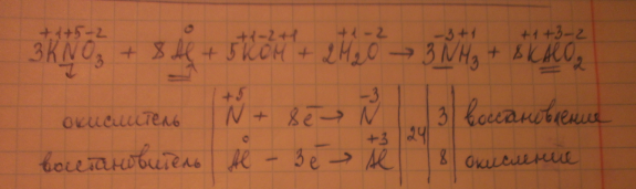 Составьте уравнение процессов восстановления и окисления. схема реакций KNO3 + Al+ KOH+ H2O⇒ NH3+KAlO2