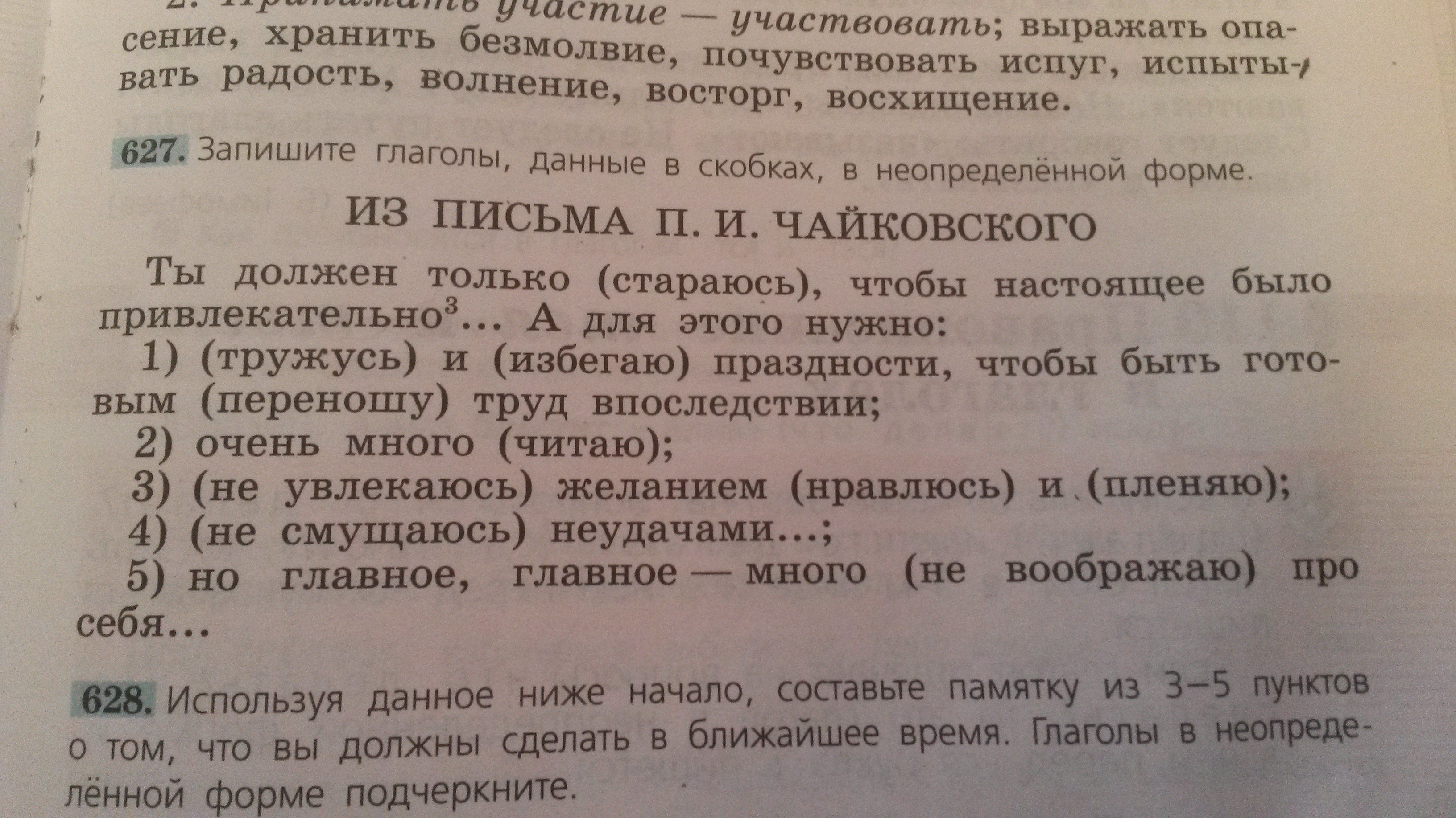 Здесь везде надо поставить эти глаголы в неопределенный форму: стараться, трудиться, избегать, переносить, читать, не увлекаться, нравиться и пленять, не смущаться, не воображать.
