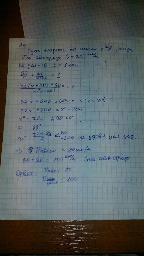 Автомобиль проехал 60км по автостраде и 32км по шоссе,затратив на весь путь 1час. Найти скорость автомобиля на каждом участке пути,если по автостраде он двигался на 20км/ч быстрее , чем по шоссе .