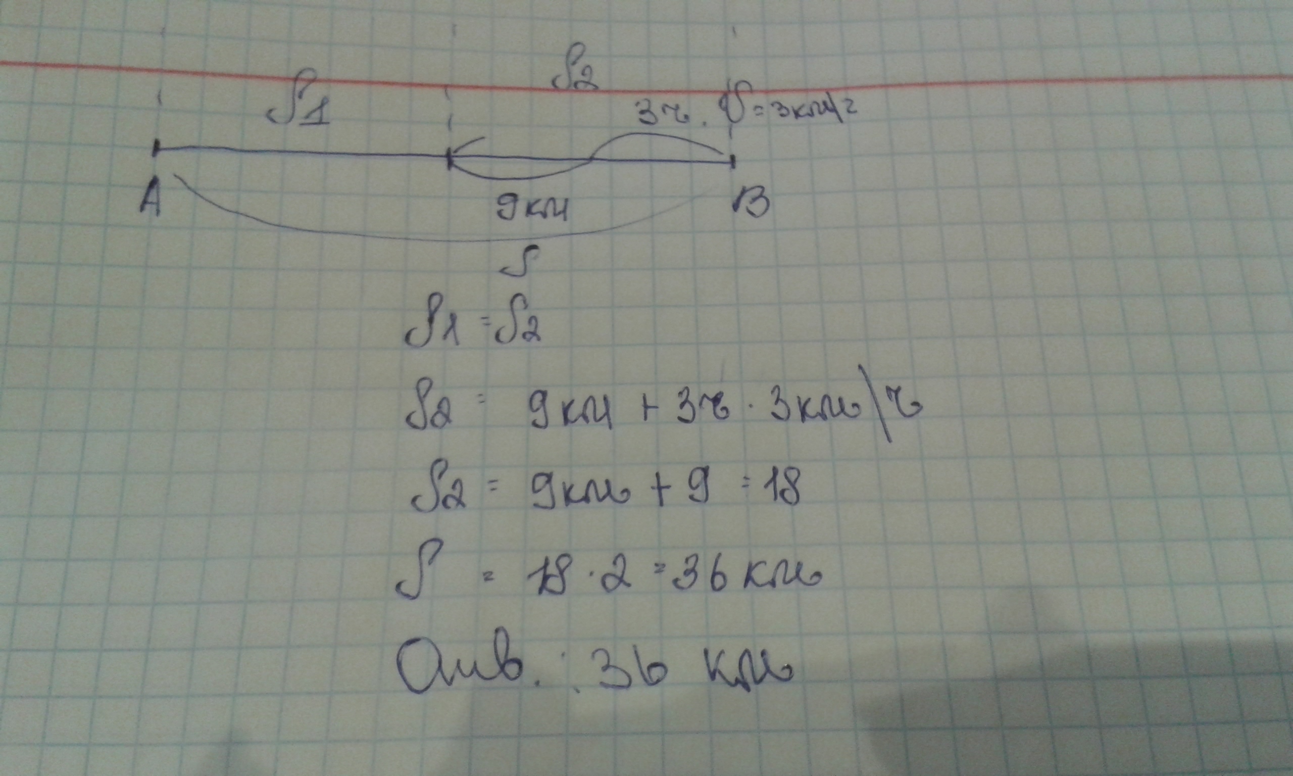 Помогите пожалуйста сделать чертёж этой задачи. Нужно очень срочно!!! Зарание спасибо!!!Выполни чертёж и реши задачу. Туристы прошли по реке на байдарках половину намеченного пути и ещё 9км. Оставшийся путь они могут пройти на байдарках за 3 ч. со скоростью 6км/ч. Узнайте весь путь,который должны были пройти туристы на байдарках.