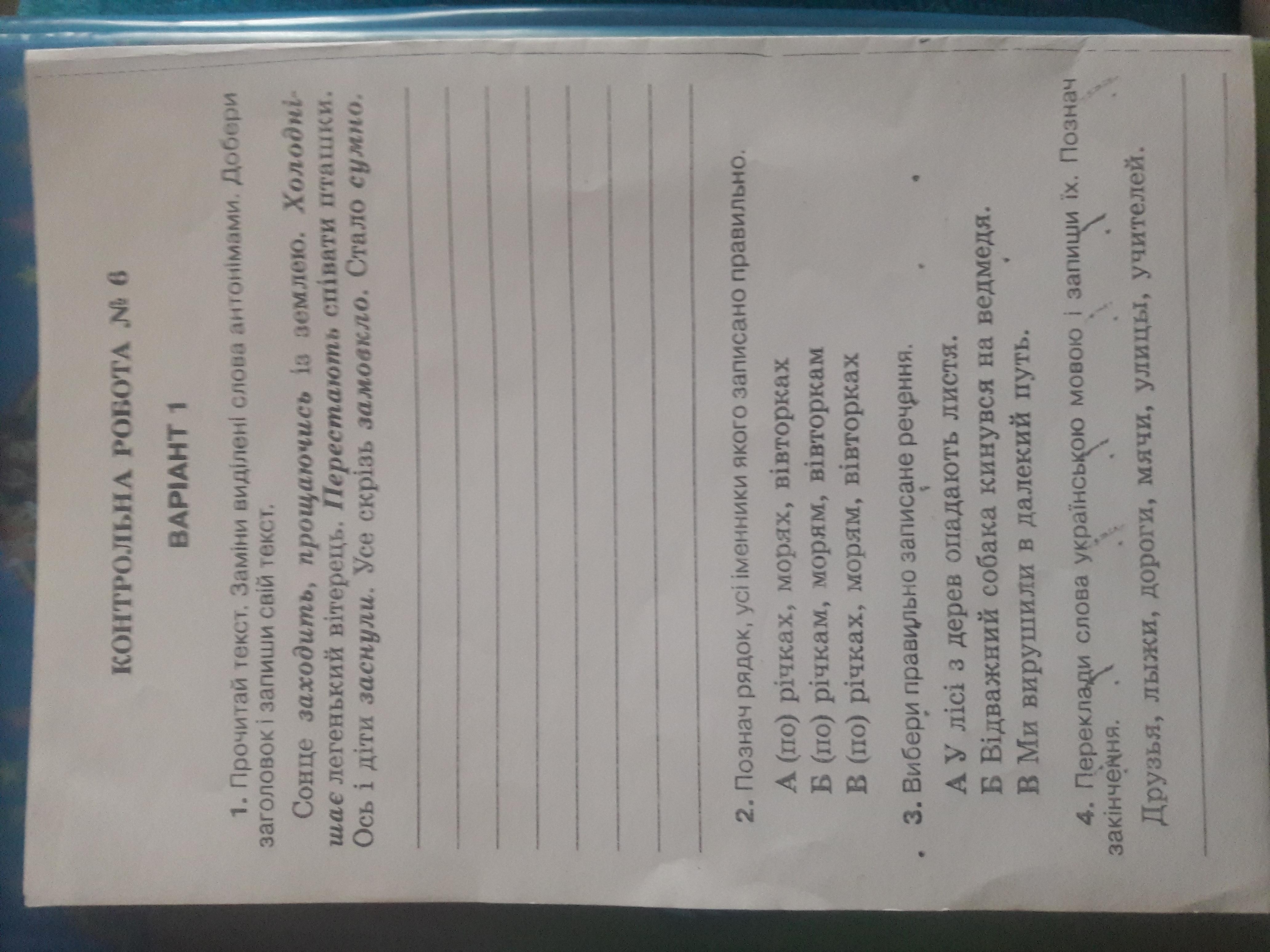 1. сонце сходить, вітаючись з небом. теплішає легенький вітерець. починають співати пташки. усі діти прокидаються. усе скрізь ожило. стало весело2. б3. в4. друзі, лижі, дороги, м'ячі, ,вулиці, вчителі.