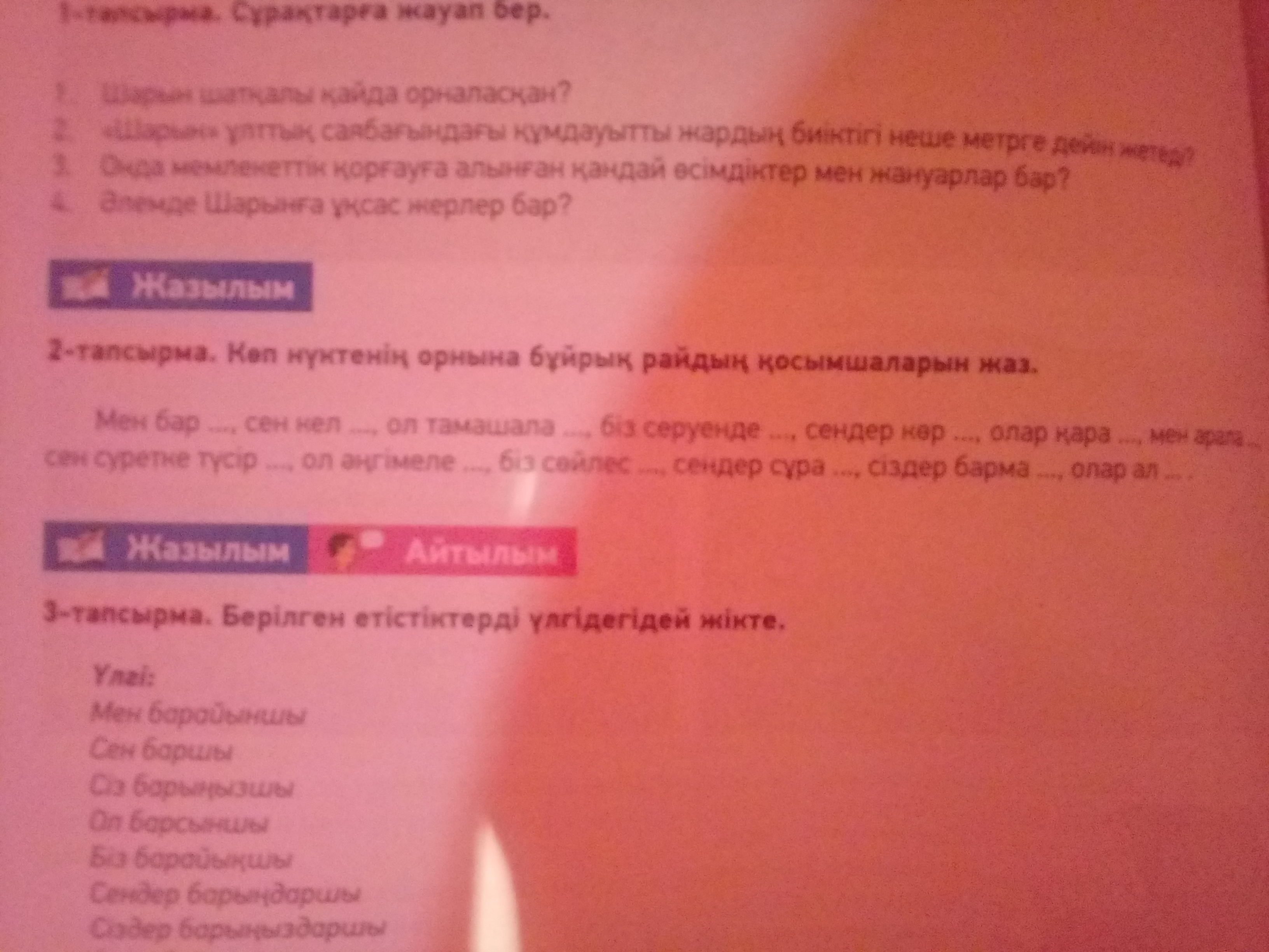 Мен барайын, сен келесің , ол тамашаласын, біз серуендейік,сендер көріңдер,олар қарасын,мен аралайын,сен суретке түсіресің ол әңгймелесін, біз сөйлесейік, сендер сұраңдар,сіздер бармаңыздар, олар алмасын