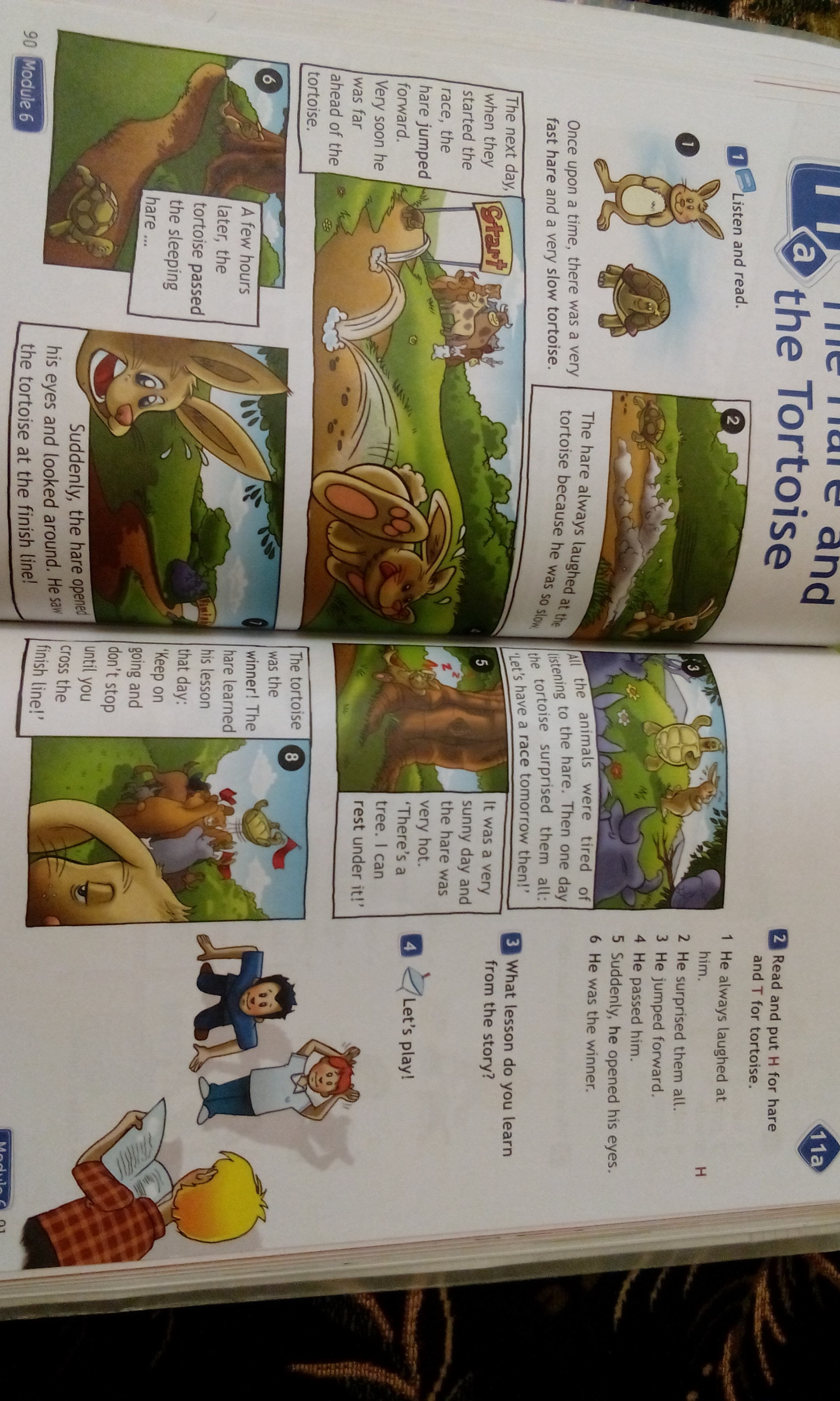 A few hours later, the tortoise passed the sleeping hare. When the hare opened his eyes, he saw the tortoise at the finish line! That was a lesson for the hare: keep on going and don't stop until you cross the finish line.