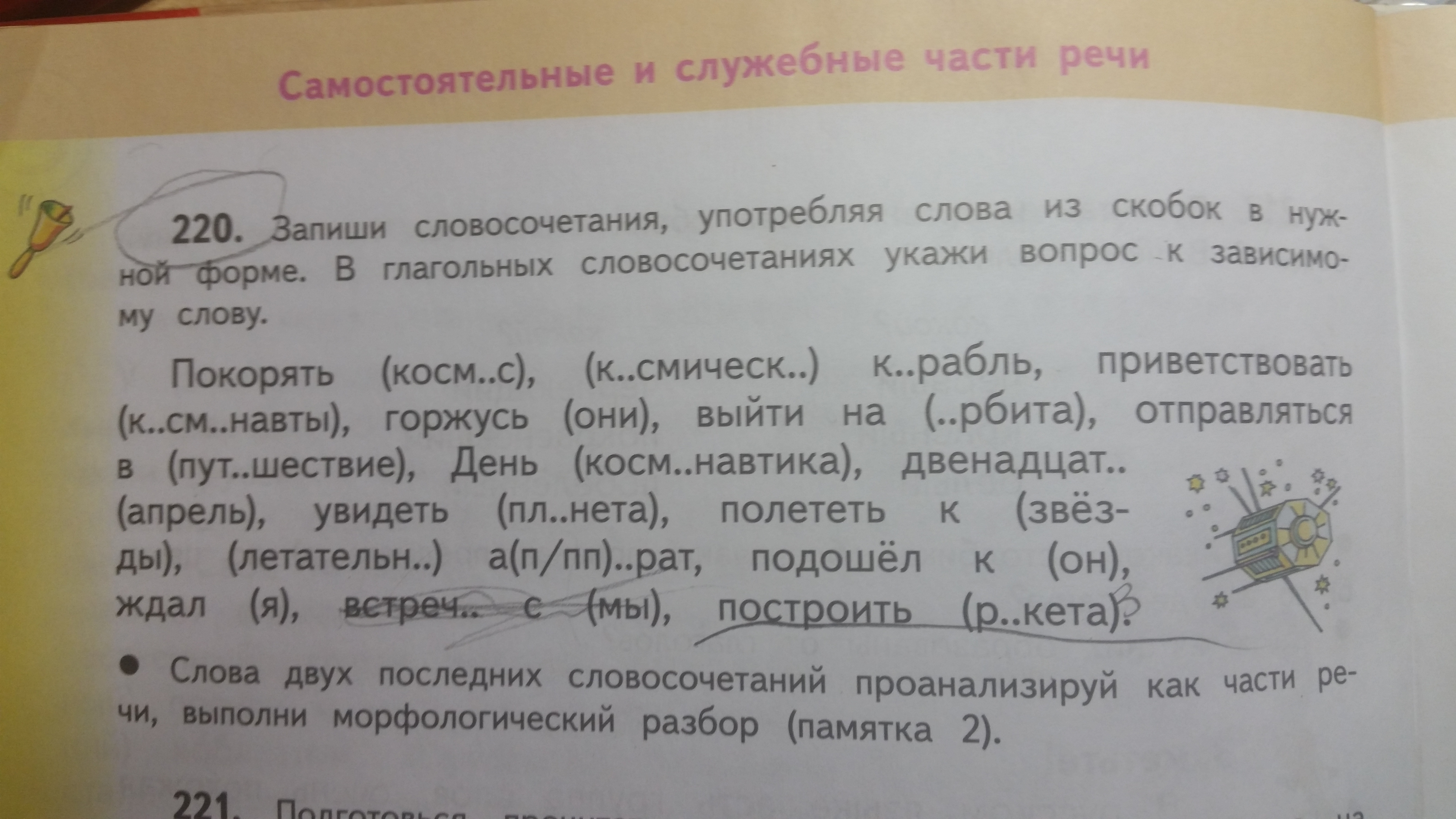 покорять ( что? ) космос, приветствовать ( кого? ) космонавтов, горжусь ( кем? ) ими, выйти ( куда? ) на орбиту, отправляться ( куда? ) в путешествия, увидеть ( что? ) планету, полететь ( куда? ) к звёздам, подошёл ( к кому? ) к нему, ждал ( кого? ) меня, построить ( что? ) ракету.