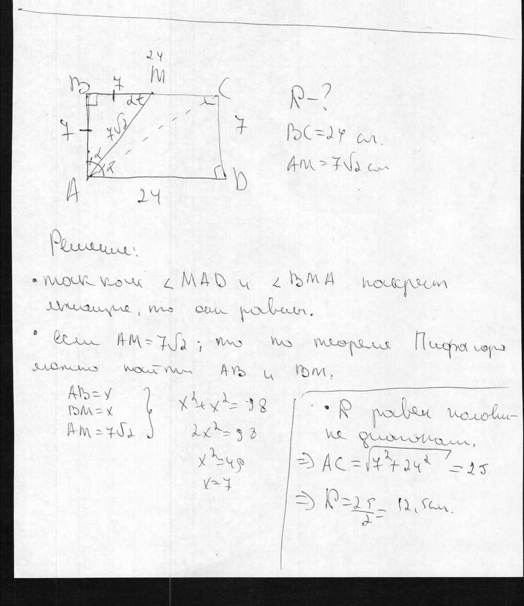 Бисектриса угла А прямоугольника АВСД пересекает его большую сторону ВС в точке М. Найдите радиус круга, описаного вокруг прямоугольника, если ВС=24см, АМ=7корня из 2см.