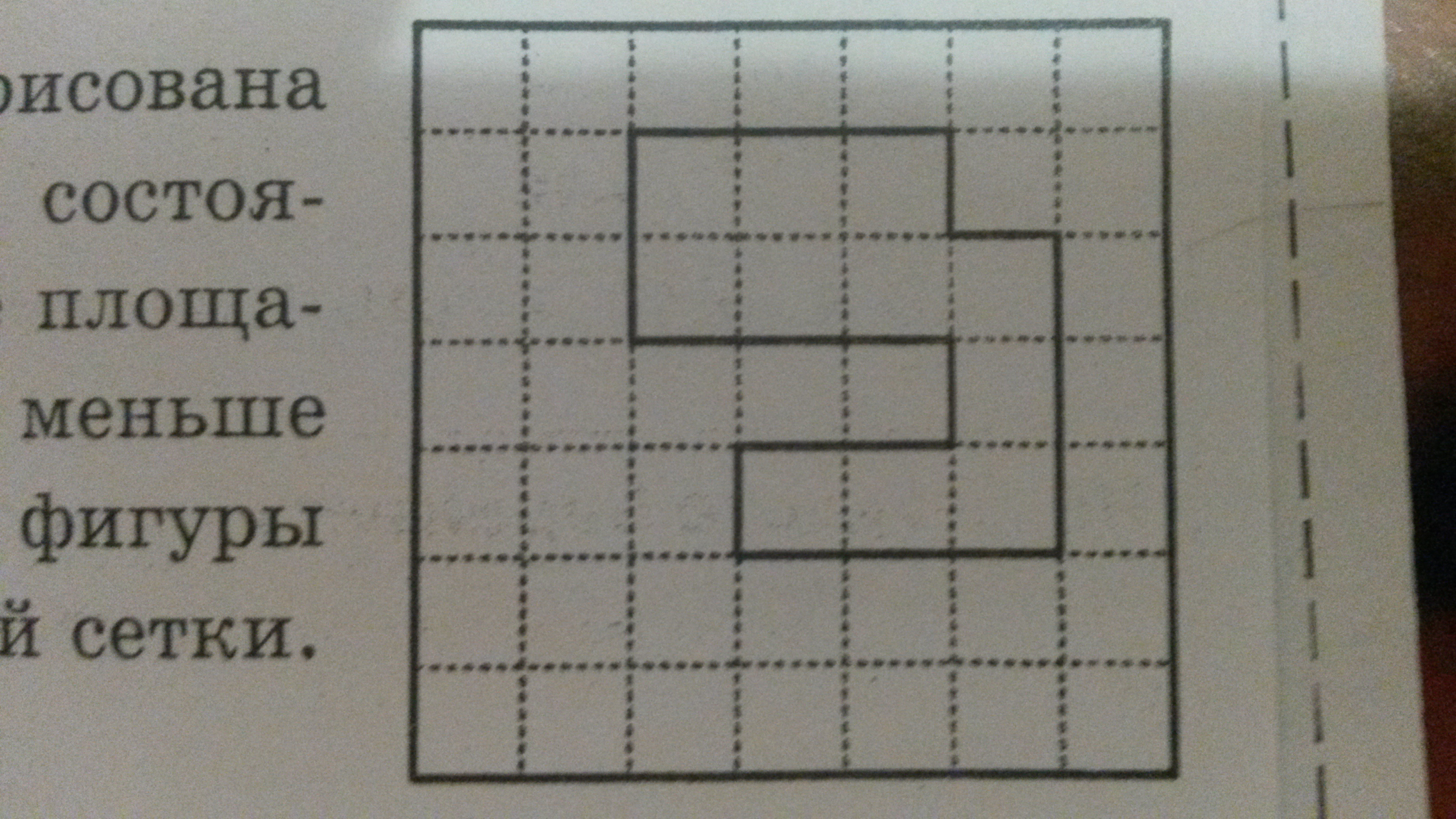 На клетчатой бумаге со стороной клетки 1 см нарисована фигура (см. Рисунок) Нарисуйте другую фигуру, состоящую из клеток, площадь которой на 1 см в квадрате больше площади данной фигуры, а периметр на 2 см. меньше периметра данной фигуры. Границы вашей фигуры должны проходить только по линиям нарисованной клетки.
