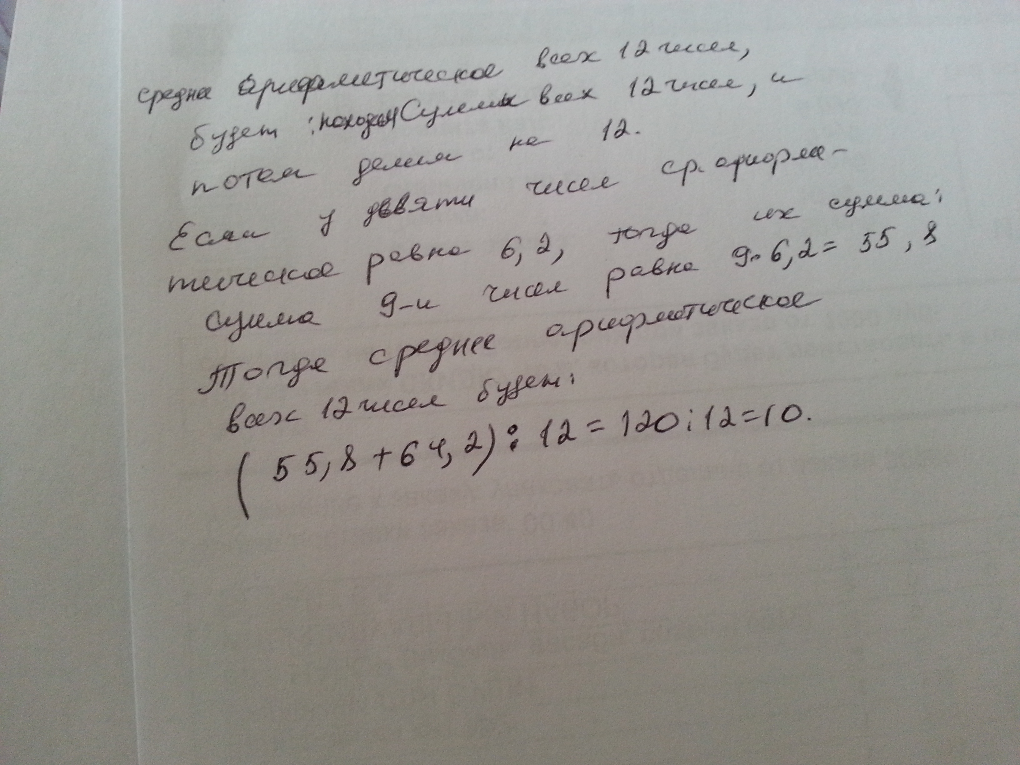 Сумма трёх чисел 64,2, а среднее арифметическое девяти других чисел 6,2. Найдите среднее арифметическое всех 12 чисел.