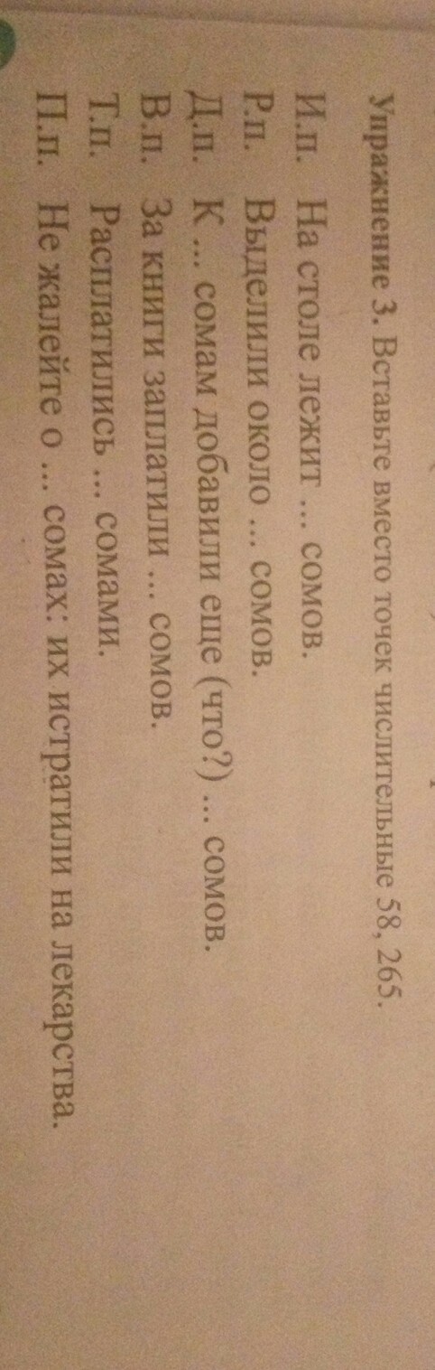И.п. на столе лежит пятьдесят восемь сомов и двести шестьдесят пять сомов. Р.п. выделили около пятидесяти восьми сомов, около двух сот шестидесяти пяти сомов. Д.п. к пятидесяти восьми сомам добавили ещё пятьдесят восемь сомов,к двухсот шестьдесят пяти сомам добавили ещё двух сот шестидесяти пяти сомам. В.п.за книги заплатили пятьдесят восемь сомов, за книги заплатили двести шестьдесят пять сомов Т.п. расплатились пятью десяти восьми сомами,расплатились двух сот шестьдесят пяти сомами П.п. не жалейте о пяти десяти восьми сомах: их истратили на лекарства, не жалейте о двух сот шести десяти пяти сомах:их истратили на лекарства