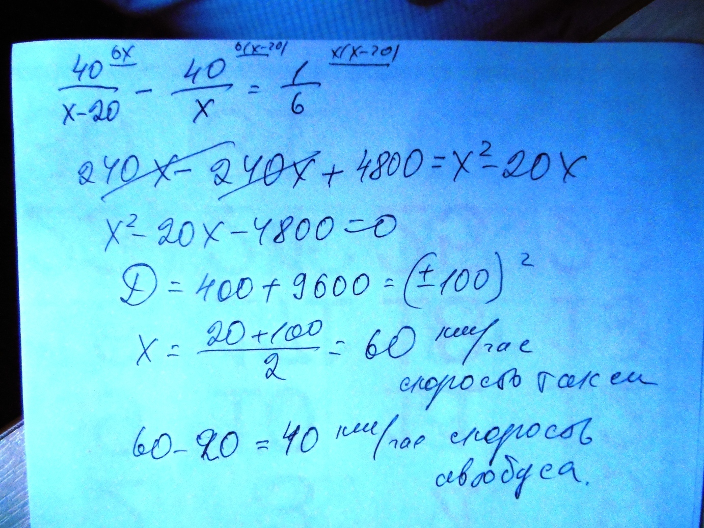 Расстояние в 40 км такси преодолело на 10 мин. быстрее, чем автобус. Какова скорость каждого, если скорость такси на 20 км/ч больше скорости автобуса
