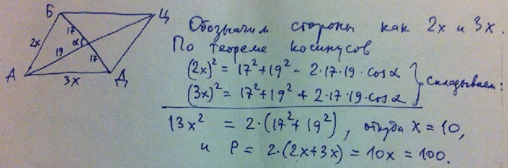 Диагонали параллелограмма 34см и 38см, а стороны относятся как 2:3 . Найдите периметр параллелограмма.