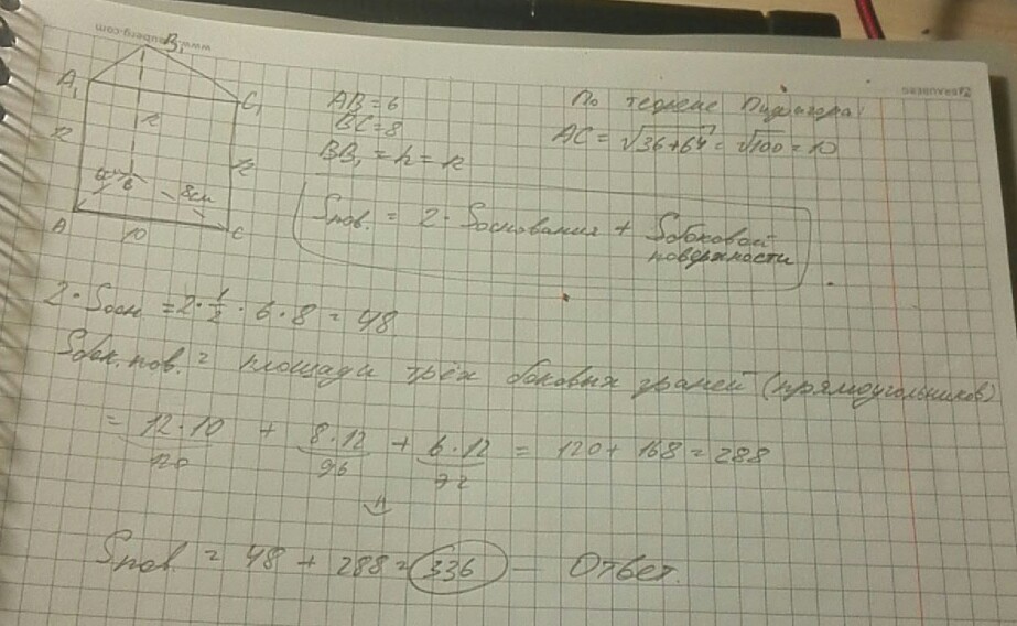 основание прямой призмы прямоугольного треугольника с катетами 6см и 8см.Высота призмы 12см.Найдите площадь поверхности.С чертежом